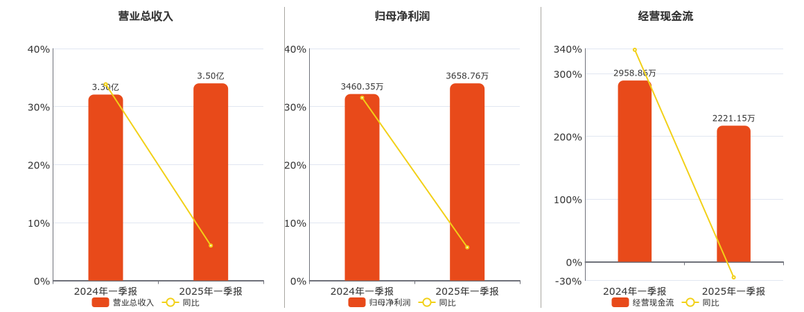 公司营业总收入为3.50亿元。归母净利润为3658.76万元。经营活动现金净流入为2221.15万元,较去年同报告期经营活动现金净流入减少737.72万元,同比较去年同期下降24.93%。