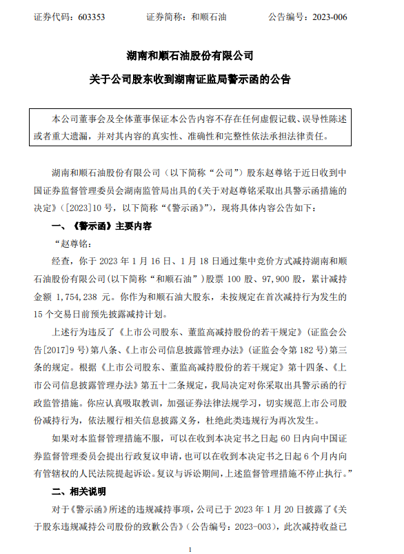 和顺石油表示,上述减持收益已悉数上交至公司银行账户,股东赵尊铭收到上述《警示函》后,高度重视其中指出的相关问题,表示将引以为戒,认真吸取经验教训,切实加强自身对相关法律法规、规范性文件的学习,从严管理本人证券账户、审慎操作,坚决杜绝此类情况再次发生。公司将加强对相关人员在法律法规和规范性文件方面的学习和培训,督促其严格遵守相关规定,积极履行信息披露义务。