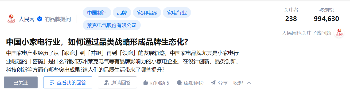面对我国家电品牌全面打入国际市场,实现了从“中国制造”到“中国智造”的转变,人民网在近日提出了“中国小家电行业,如何通过品类战略形成品牌生态化?”的问题。问题发布之后,火速在知乎收获了近百万的浏览量,并一度登上知乎热榜。其中,不仅有众多知友的踊跃参与,积极回答,还有不少权威媒体从专业的角度进行了剖析。而无论是凤凰网、每日经济新闻、荔枝新闻、财经十一人还是中国企业报这样的知名媒体,都不约而同的在他们的回答中提到了一家我国的民族小家电品牌,这就是莱克电气!