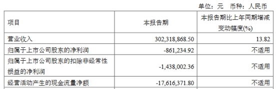 今年一季度,公司实现营业收入3.02亿元,同比增长13.82%;实现归属于上市公司股东的净利润-86.12万元;实现归属于上市公司股东的扣除非经常性损益的净利润-143.80万元;经营活动产生的现金流量净额-1761.64万元。