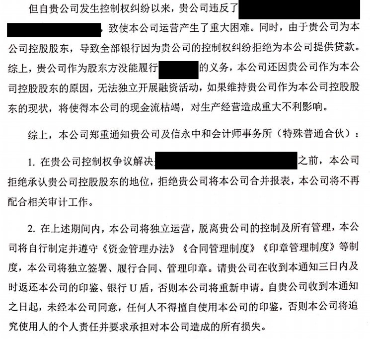 因此,华菱新能源通知华菱精工及相关会计师事务所:在上市公司控制权争议解决??之前,公司拒绝承认上市公司控股股东的地位,拒绝上市公司将其合并报表,公司也将不再配合相关审计工作。华菱新能源同时称,公司将独立运营,脱离上市公司的控制及所有管理,其将自行制定并遵守相关制度,将独立签署、履行合同、管理印章。