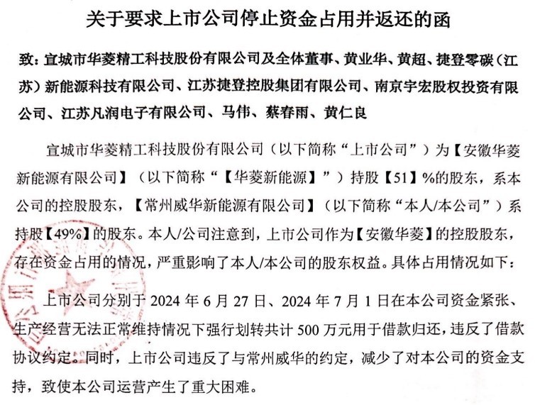 吕威江是安徽华菱新能源有限公司(以下简称华菱新能源,是华菱精工持股51%的子公司)的间接股东。7月23日,他向《每日经济新闻》记者透露,7月22日,华菱新能源已向上市公司及相关方发出《关于要求建立独立规范的企业运营制度的函》《关于要求上市公司停止资金占用并返还的函》《关于不再认可宣城市华菱精工科技股份有限公司控股股东地位的通知》(以下简称《通知》)。