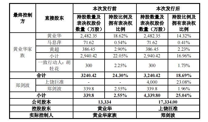 权益变动前,上饶巨准未持股,郑剑波持股2.55%;发行完成后,郑剑波将成为实际控制人,二者持股比例变为23.08%和1.96%,合计25.04%,超过黄业华及一致行动人的合计持股比例18.69%,公司控股股东将由黄业华变更为上饶巨准。