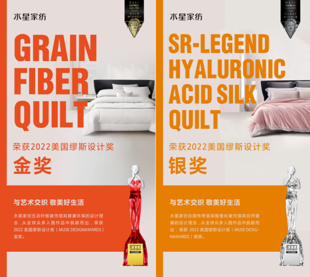 此外,采用提取自自然植物的五谷蛋白,并按照科学比例进行复配的“五谷纤维被”荣获2022美国缪斯设计奖金奖;而“丝路传奇玻尿酸蚕丝被”别具匠心地将玻尿酸成分植入蚕丝被面料中,进一步为肌肤带来丝滑触感,也因此荣获2022美国缪斯设计奖银奖。