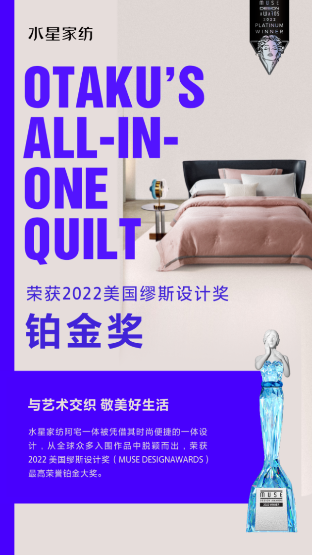 此次,入围评选的“阿宅一体被”便凭借其时尚便捷、轻松水洗的一体化设计,100%桑蚕丝填充、纯天然植物纤维面料的环保式生产,从全球众多入围作品中脱颖而出,荣获2022 美国缪斯设计奖(MUSE DesignAwards)最高荣誉——铂金大奖;