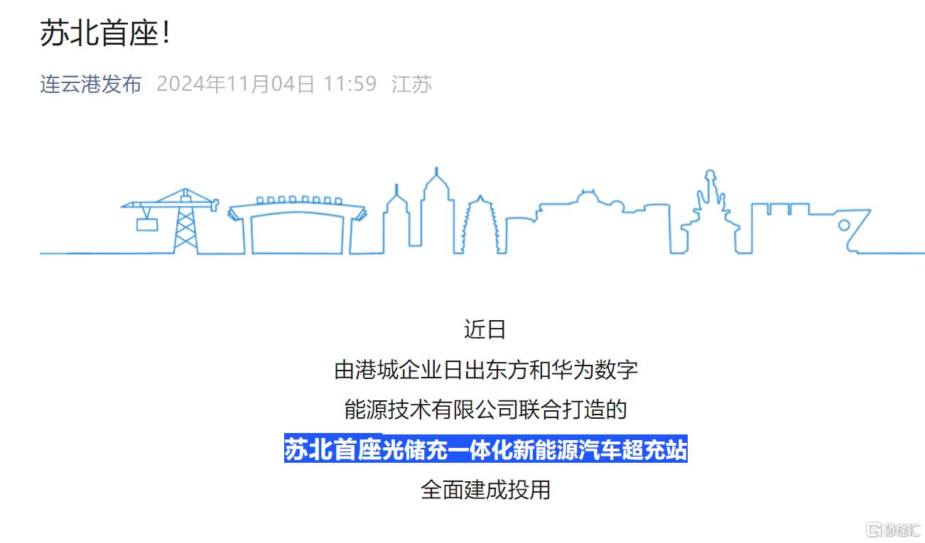 11月4日,连云港发布宣布,苏北首座光储充一体化新能源汽车超充站全面建成投用。