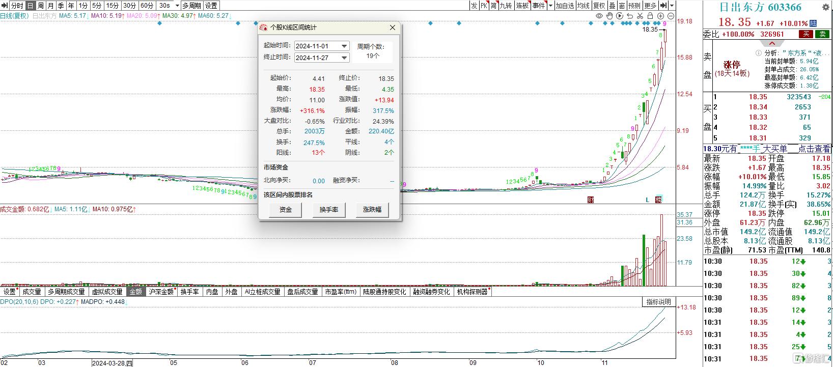 今日,日出东方开盘后快速拉升涨停,实现18天14板,报18.35元/股,总市值149.2亿元。
