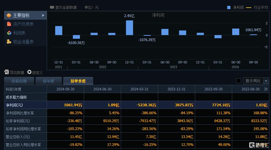 其中,第三季度的营收为11.45亿元,同比下降19.82%;净利润为1061.94万元,同比下降86.25%。
