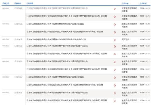 11月28日晚间,日出东方再次发布了《关于股票交易异常波动暨风险提示的公告》,表示公司股票在连续 10 个交易日内日收盘价格涨幅偏离值累计达到 100%,属于股票交易严重异常波动情形。值得注意的是,这已是日出东方近期连续多次发布此类公告,引起了市场的广泛关注。