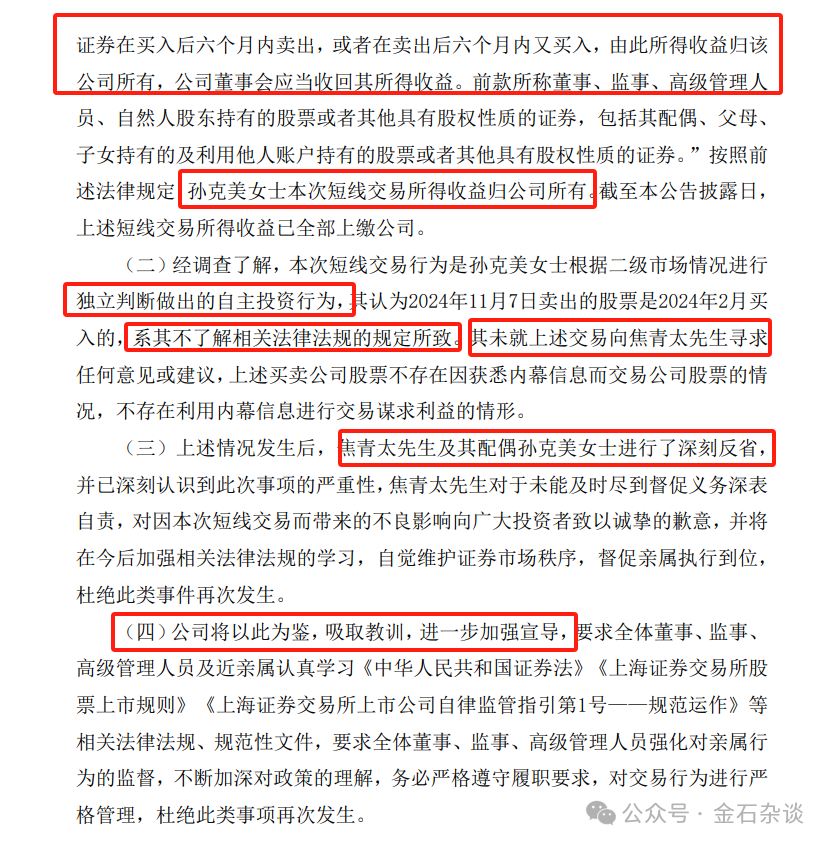 不过,有意思的是,日出东方给出的理由是:本次短线交易系孙克美独立判断自主决策,是因为不了解法规,也没有寻求老公的建议。不存在,绝不存在内幕交易。