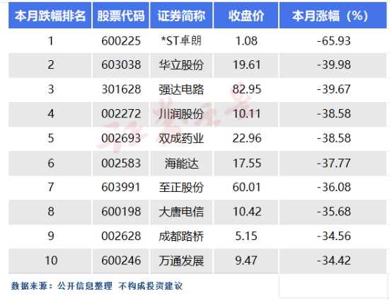 让我们转换目光,聚焦到本月跌幅居前的个股,*ST卓朗因涉嫌财务造假,连续21个跌停排在了跌幅榜的断层首位,此外华立股份、强大电路两只个股跌幅也接近40%。