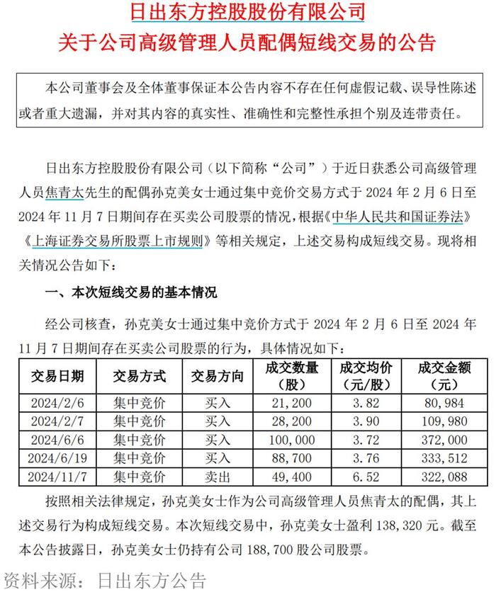 但当日收盘后,日出东方却遭到上交所警示。根据公告,公司高级管理人员焦青太的配偶孙克美通过集中竞价交易方式于2024年2月6日至2024年11月7日期间存在买卖公司股票的情况,上述交易构成短线交易。