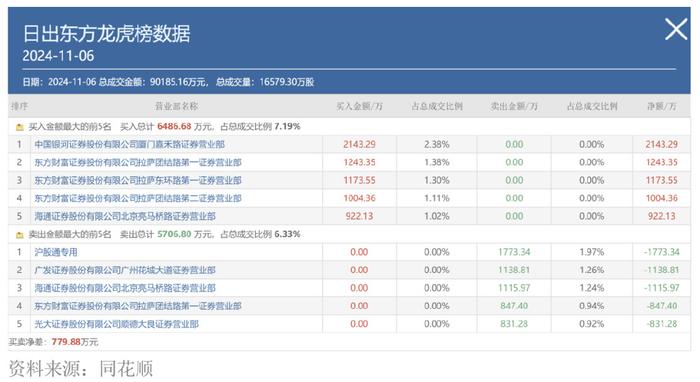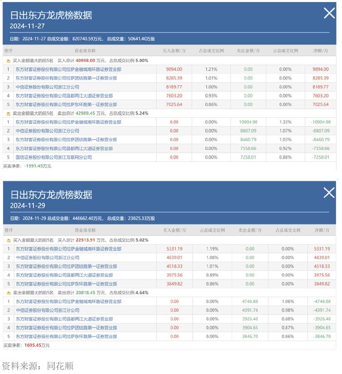 11月27日,该股从跌停位开盘后拉至涨停。交易龙虎榜数据显示,东方财富证券拉萨金融城南环路营业部、拉萨团结湖路第一证券营业部、拉萨东环路第一证券营业部分别买入9894万元、8285.39万元、7025.64万元。
