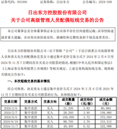 今年11月30日,日出东方披露了一则关于其高管配偶违规进行短线交易的公告,迅速引发市场关注。原来,日出东方副总焦青太的配偶孙克美女士于2024年2月6日至2024年11月7日期间存在通过集中竞价交易方式买卖公司股票的情况,上述交易构成短线交易且违反了《中华人民共和国证券法》和《上海证券交易所股票上市规则》等相关规定。