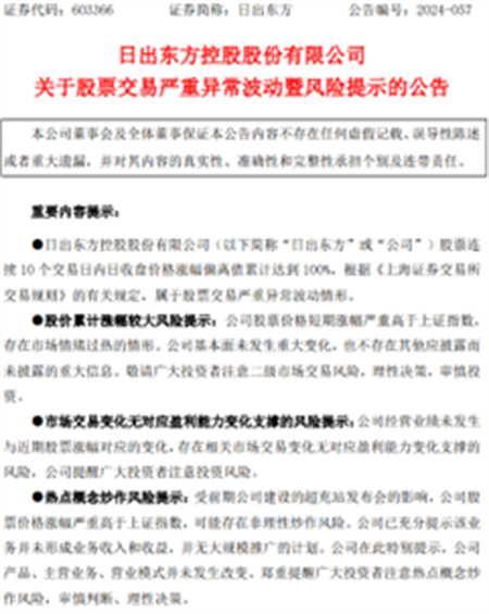 日出东方在公告中表示,其股票连续10个交易日内日收盘价格涨幅偏离值累计达到100%,根据有关规定,早已属于股票交易严重异常波动情形。公司股票价格短期涨幅严重高于上证指数,存在市场情绪过热的情形。而公司基本面未发生重大变化,也不存在其他应披露而未披露的重大信息。公司经营业绩未发生与近期股票涨幅对应的变化,存在相关市场交易变化无对应盈利能力变化支撑的风险。而且受前期公司建设的超充站发布会的影响,公司股票价格涨幅严重高于上证指数,可能存在非理性炒作风险。公司已充分提示该业务并未形成业务收入和收益,并无大规模推广的计划。公司在此特别提示,公司产品、主营业务、营业模式并未发生改变。