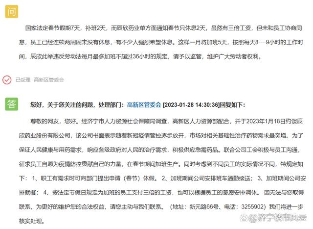近日,有网友投诉济宁辰欣药业春节违规加班,网友表示法定春节休7天补班2天,但是辰欣药业春节只休息2天,虽然有3倍工资但是并没有和员工协商同意,而且已经两周周末没有休息了,这样计算一个月加班5天,一天8、9个小时的工作时长,违反了劳动法每月加班最多不超过36小时的规定,希望有关部门监管。