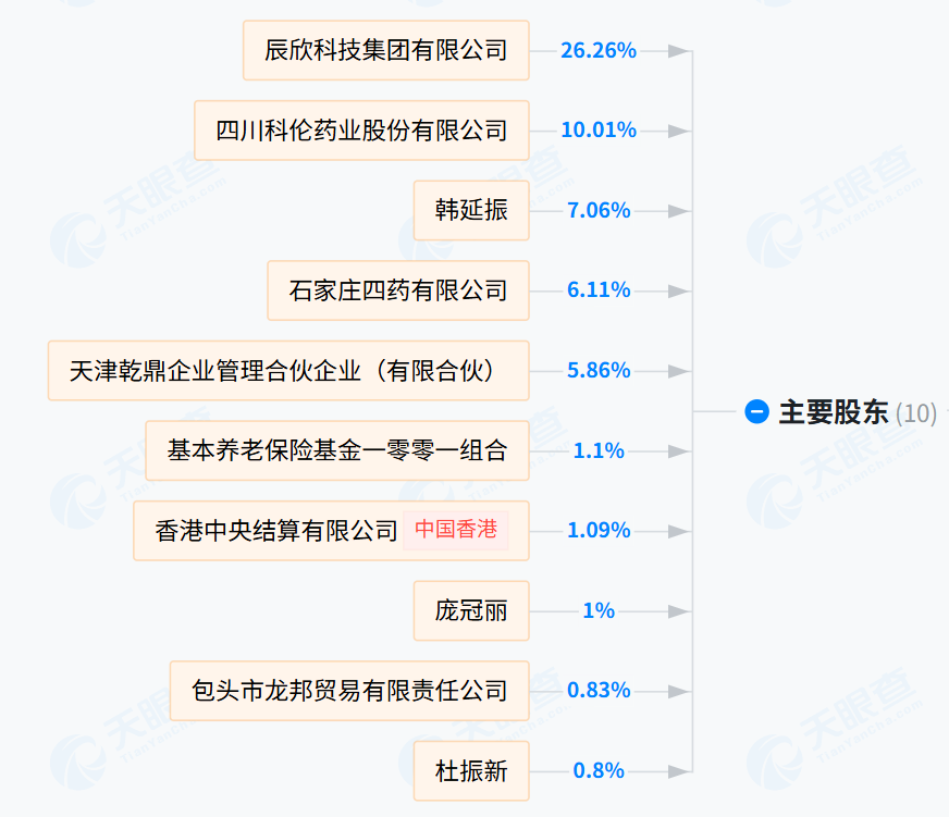 数据显示,辰欣药业前三大股东分别为辰欣科技集团有限公司、四川科伦药业股份有限公司以及韩延振,持股比例依次为26.26%、10.01%、7.06%。在上述减持计划完成后,韩延振的持股比例预计将降至4%左右,届时他或让出辰欣药业第三大股东的位置,退居第五大股东。