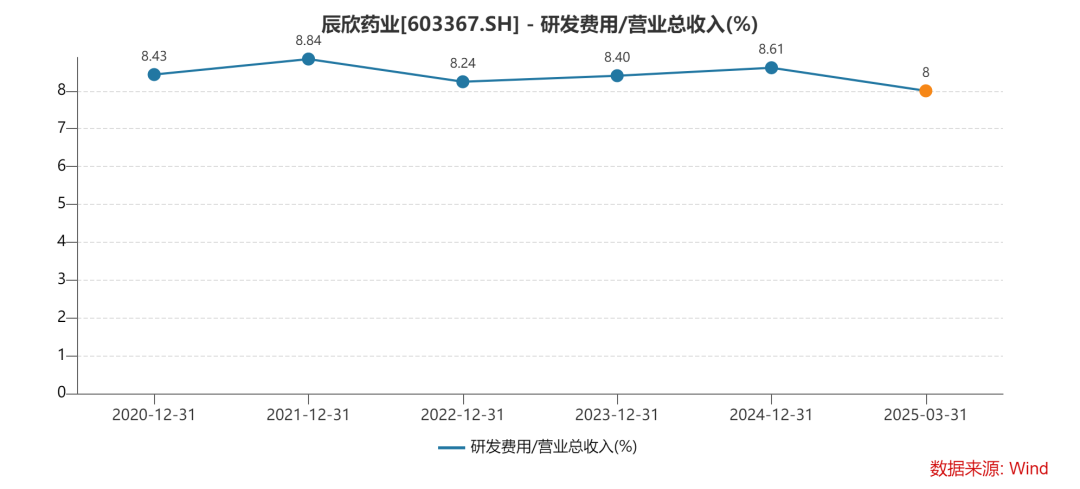 自2020年起,辰欣药业研发投入占营业收入的比例持续维持在8%以上。然而,进入2025年一季度,这一比例出现下滑趋势,且显著低于同行业可比公司——恒瑞医药(21.28%)、科伦药业(11.03%)及信立泰(10.18%)等。