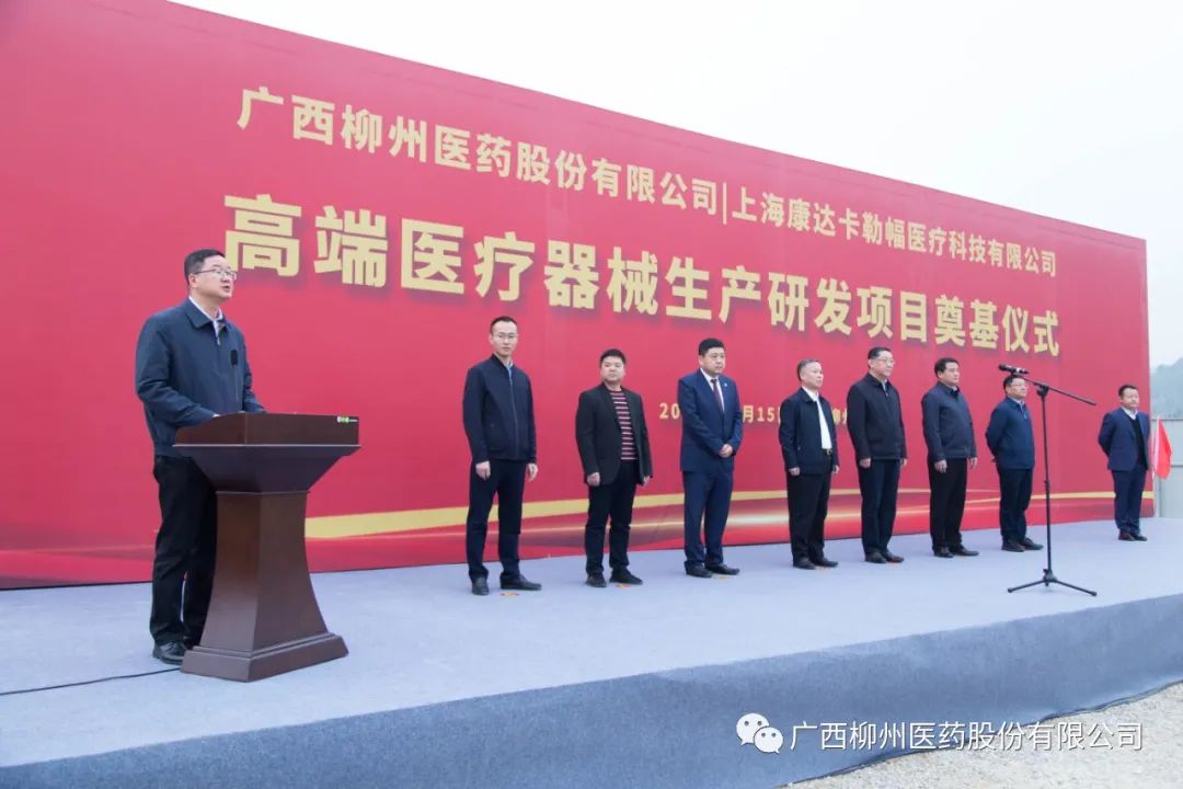 12月15日上午,广西柳州医药股份有限公司-上海康达卡勒幅医疗科技有限公司高端医疗器械生产研发项目奠基仪式在鱼峰区柳药股份健康产业园隆重举行。柳州市委副书记、市长张壮,副市长汤振国,秘书长刘伯臣,上海康达卡勒幅董事长林海,公司董事长朱朝阳,广西康达卡勒幅总经理祁俊等出席活动。