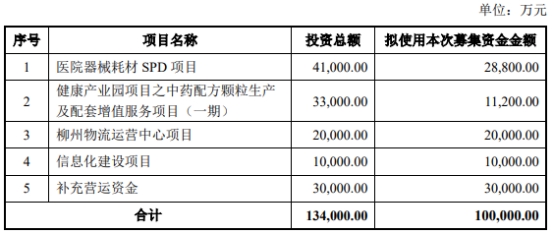 柳药集团2023年6月14日披露2023年度向特定对象发行A股股票募集说明书(申报稿),公司本次向特定对象发行股票募集资金总额不超过人民币100,000.00万元(含本数),扣除发行费用后的募集资金净额拟用于医院器械耗材SPD项目、健康产业园项目之中药配方颗粒生产及配套增值服务项目(一期)、柳州物流运营中心项目、信息化建设项目、补充营运资金。