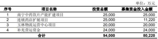 柳药集团2020年2月20日披露公开发行可转换公司债券上市公告书显示,公司本次公开发行可转换公司债券募集资金扣除发行费用后,将投资于南宁中药饮片产能扩建项目、连锁药店扩展项目、玉林物流运营中心项目、补充营运资金。