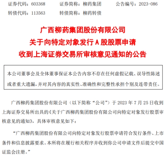 中国经济网北京7月26日讯柳药集团(603368.SH)昨日晚间披露关于向特定对象发行A股股票申请收到上交所审核意见通知的公告。公司收到上交所出具的《关于广西柳药集团股份有限公司向特定对象发行股票审核意见的通知》,审核意见为:广西柳药集团股份有限公司向特定对象发行股票申请符合发行条件、上市条件和信息披露要求。上交所将在履行相关程序并收到公司申请文件后提交中国证监会注册。