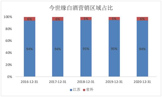 从产品的销售地域可以看出,今世缘在过去五年中,江苏省内的销售占比超过94%,而省外的销售仅占总销量的6%上下。