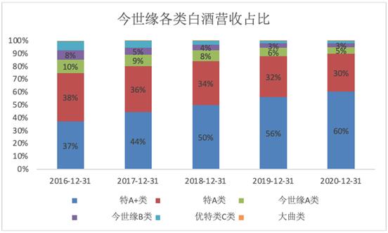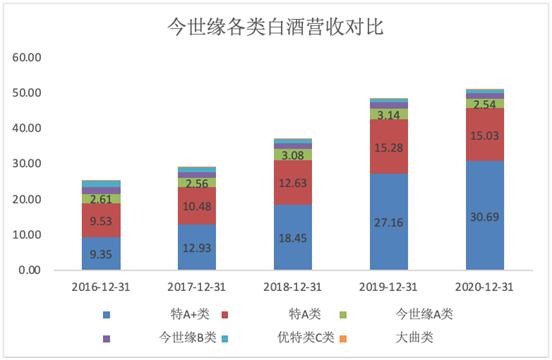 再看看不同产品的营收数据。从过去5年的数据不难发现,今世缘的所有产品中,特A类产品的占比逐年增加,从2016年的75%增加到2020年的90%,而这恰好是定位中高端的价格带,所以可以发现,整个公司的营收主要看特A类产品的销量。