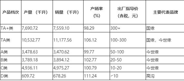 当然,不同品牌下,对应的产品也有不同的档次分级和香型,这也是白酒行业的常见“戏法”了,主要是为了迎合不同价格带客户的需求。根据今世缘2020年财报,《正经社》分析师整理了相关产品的产销和出厂价情况,如下表所示。