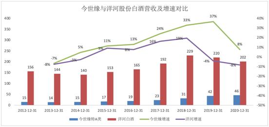三十年河东,三十年河西。在白酒复苏的5年中,洋河股份的下坡路,给了今世缘的赶超机会。《正经社》分析师整理了从2012年开始到2020年,从洋河股份中高端白酒和今世缘特A类白酒的营收及增长数据中,不难看出,从2015年开始,虽然洋河股份的整体营收高于今世缘,但今世缘中高端白酒的增长率一直高于洋河股份,而且差距越来越大。