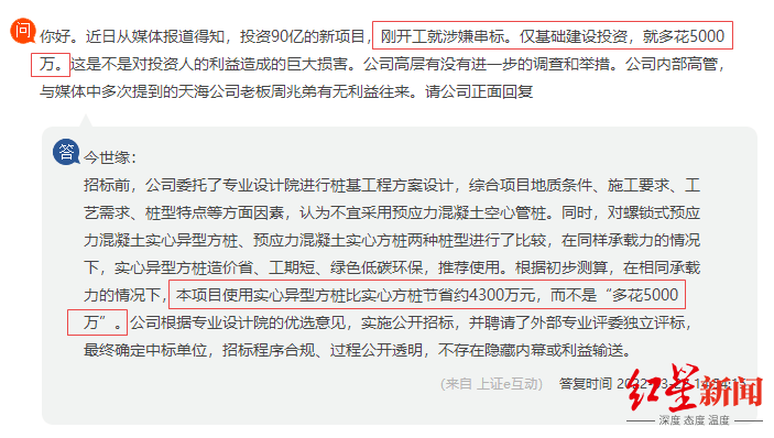 今世缘董秘进一步解释称,公司委托专业设计院进行桩基工程方案设计,综合项目地质条件、施工要求、工艺需求、桩型特点等方面因素,认为不宜采用预应力混凝土空心管桩。同时,对螺锁式预应力混凝土实心异型方桩、预应力混凝土实心方桩两种桩型进行了比较,在同样承载力的情况下,实心异型方桩造价省、工期短、绿色低碳环保,推荐使用。根据初步测算,在相同承载力的情况下,该项目使用实心异型方桩比实心方桩节省约4300万元,而不是“用此产品将会多出5000万元投资”。