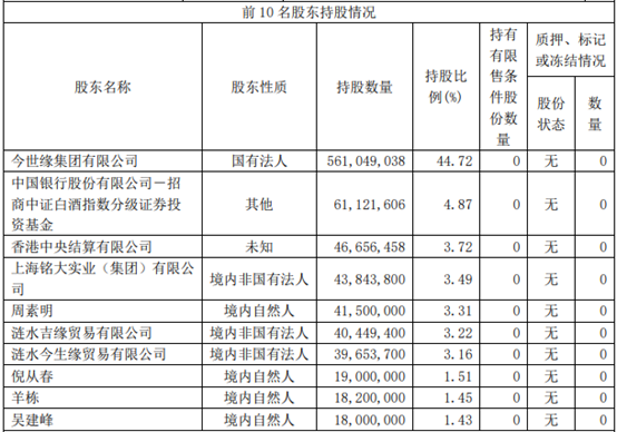 数据显示,今世缘第一大股东今世缘集团持股44.72%,涟水县人民政府为今世缘的实控人。而周素明最高时曾经持股4500万股,此后陆续有所减持。截至2021年三季报,周素明仍直接持有今世缘4150万股,位列第第五大股东,以4月6日收盘价42.35元/股计算,折合市值约17.58亿元。