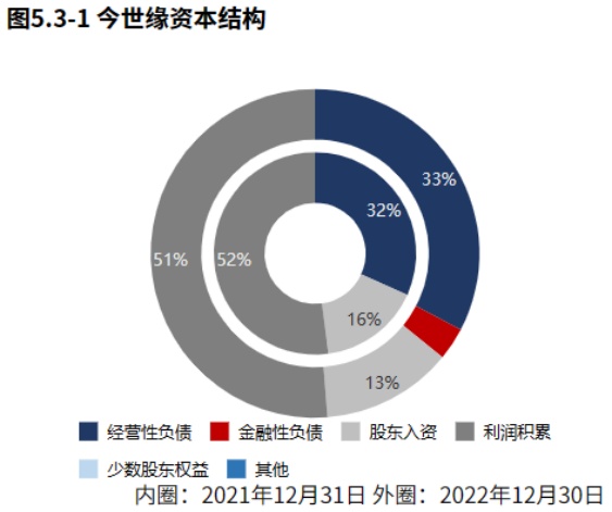 从2022年12月31日今世缘的负债及所有者权益结构来看,公司的资本引入战略为均衡利用利润积累、经营负债的并重驱动型。其中,利润积累、经营负债是资产增长的主要推动力。