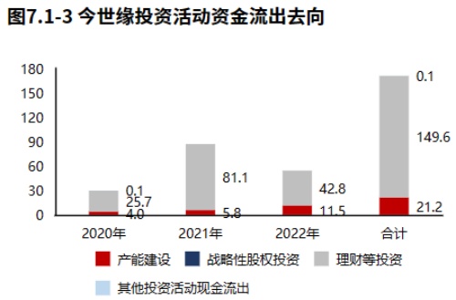 投资流出增加,主要流向了理财等投资和产能建设。今世缘2022年报的投资活动资金流出,理财等投资占比最大,占比78.86%。今世缘2020年报到本期的投资活动资金流出,集中在理财等投资,占比87.54%。