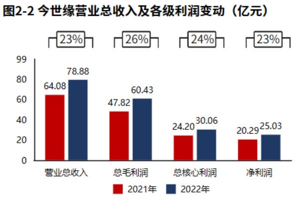公司业绩稳定增长,其中营收、毛利润和净利润均实现20%以上的增长。2022年报今世缘营业总收入78.88亿元,同比增速23%,毛利润60.43亿元,同比增速26%,核心利润30.06亿元,同比增速24%,净利润25.03亿元,同比增速23%。