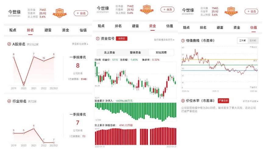 截至2022年底,今世缘在A股的整体排名上升至15位,2023Q1排名上升至第8位,在2022年底白酒III行业中的排名为第7位。截止2023年7月3日,北上资金并无特别信号。以近三年市盈率为评价指标看,今世缘估值曲线处在严重低估区间。