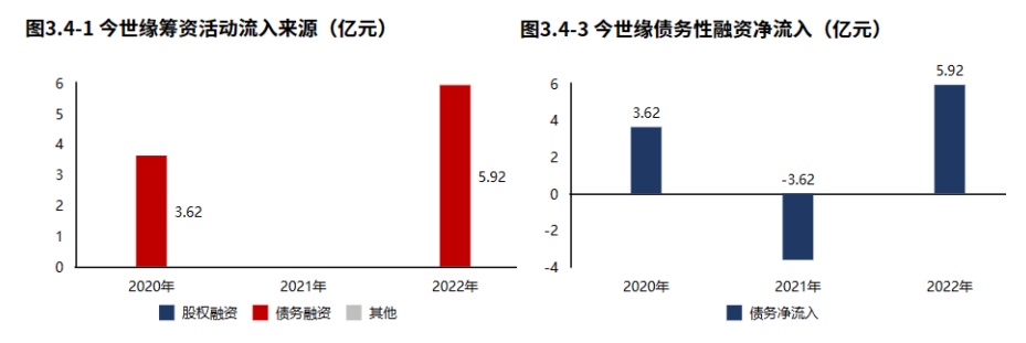 公司融资手段为债权流入,且开始出现新的贷款增长。今世缘2022年报筹资活动现金流入5.92亿元,较2021年报增加5.92亿元。今世缘2022年报筹资流入全部来源于债权流入(100.00%)。今世缘2022年报债务净流入5.92亿元,较2021年报增加9.53亿元,公司开始出现新的贷款增长。