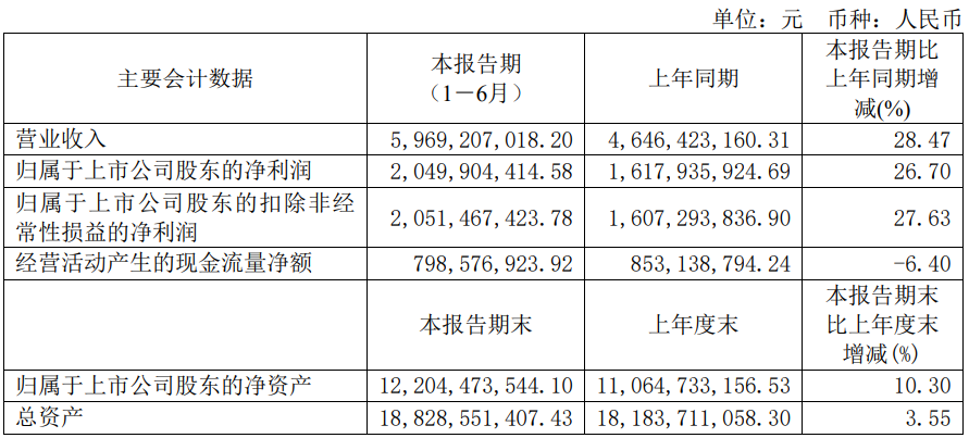今世缘昨日晚间公布2023年半年度报告。今年上半年,公司实现营业收入59.69亿元,同比增长28.47%;归属于上市公司股东的净利润20.50亿元,同比增长26.70%;归属于上市公司股东的扣除非经常性损益的净利润20.51亿元,同比增长27.63%;经营活动产生的现金流量净额7.99亿元,上年同期为8.53亿元,同比下降6.40%。