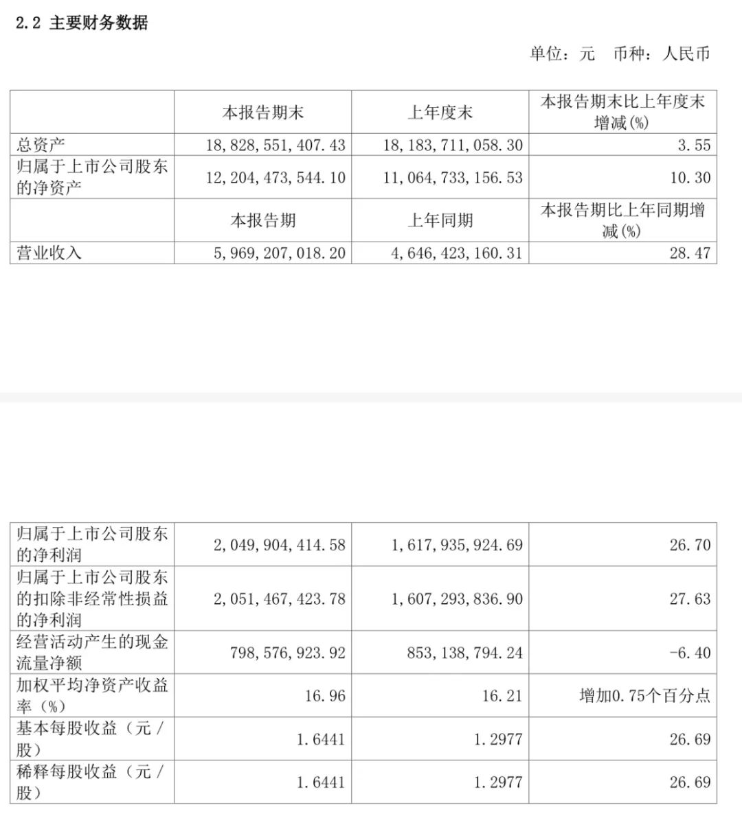 2023年上半年,公司实现营业收入59.69亿元,同比增长28.47%;归母净利润20.5亿元,同比增长26.7%。