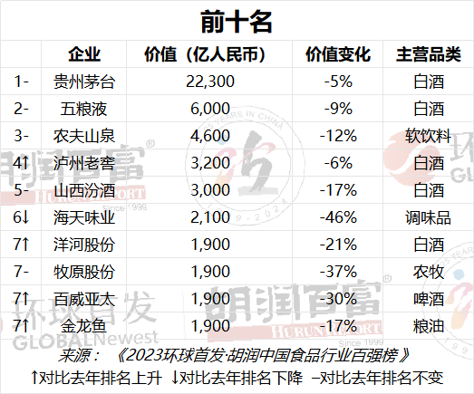 贵州茅台以2.2万亿价值蝉联中国食品行业最具价值企业,比去年下降5%。五粮液价值下跌9%,仍以6000亿元位居第二。前十中仍有5家白酒企业:茅五泸汾洋,包括贵州茅台、五粮液、泸州老窖、汾酒、洋河。