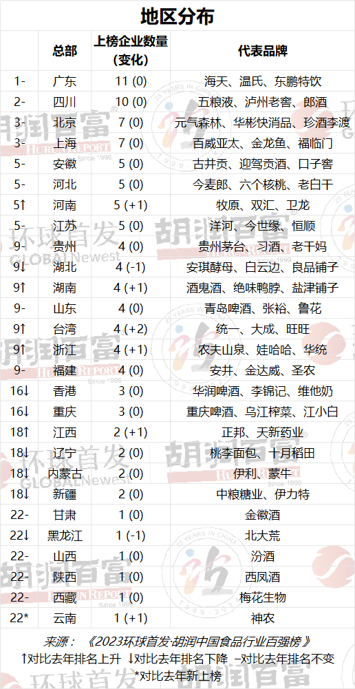 总部在广东和四川的企业依然最多,分别有11家和10家;其次是上海和北京,各有7家。江苏有5家企业上榜,位居第五。江苏上榜企业的代表有洋河、今世缘、恒顺。此外上榜苏企还有南京的苏垦农发、常州的立华股份。
