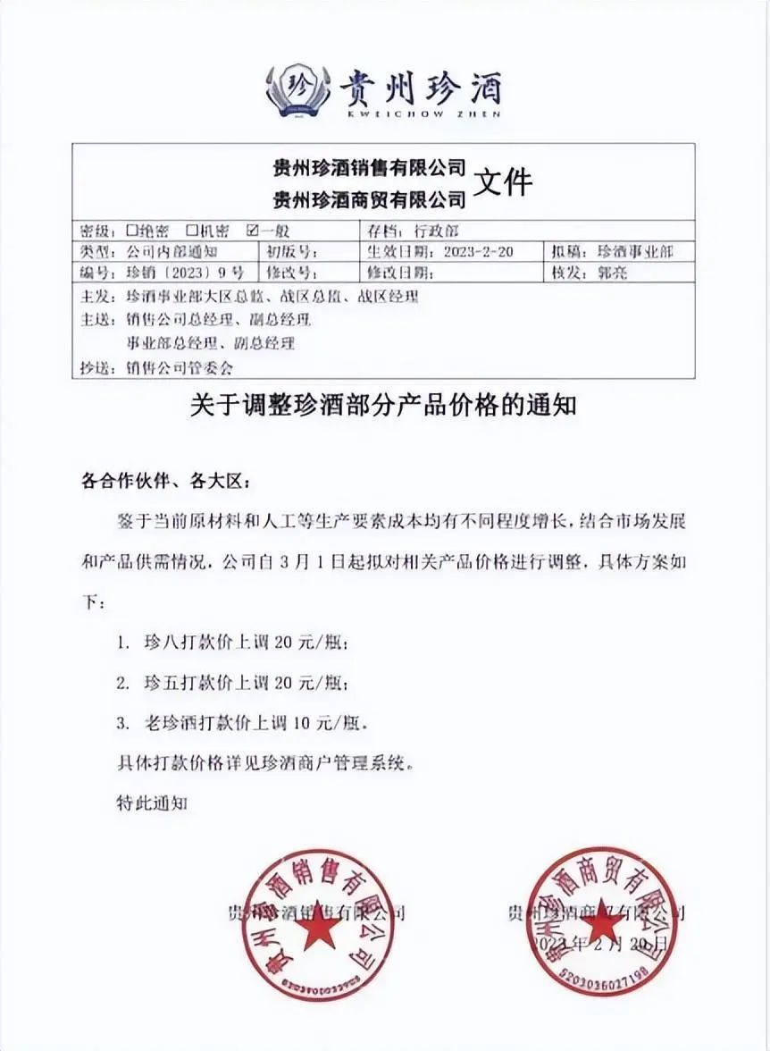 贵州珍酒于2023年3月1日起珍八打款价上调20元/瓶、珍五打款价上调20元/瓶、老珍酒打款价上调10元/瓶。