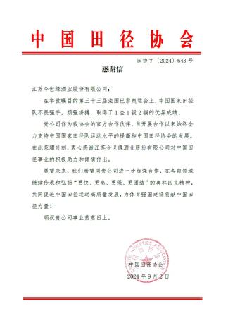 近日,江苏今世缘酒业股份有限公司收到一封来自中国田径协会的感谢信,信中表示,今世缘酒业作为中国田径协会的官方合作伙伴,始终全力支持中国国家田径队运动水平的提高和中国田径协会的发展,彰显出双方合作的显著成效与深远意义。在举世瞩目的体坛盛会上,中国国家田径队不畏强手,顽强拼搏,取得了1金1银2铜的优异成绩,中国田径协会感谢江苏今世缘酒业股份有限公司对中国田径事业的积极助力和倾情付出,并希望同今世缘酒业进一步加强合作,在各自领域继续传承和弘扬“更快、更高、更强、更团结”的精神,共同促进中国田径运动高质量发展,为体育强国建设贡献力量。
