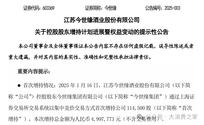 今世缘于1月18日发布公告称,其控股股东今世缘集团于1月16日通过集中竞价交易方式,首次增持公司股票114,500股,增持金额达4,997,773元(未含交易费用),并就此次增持计划进展及权益变动进行了提示。