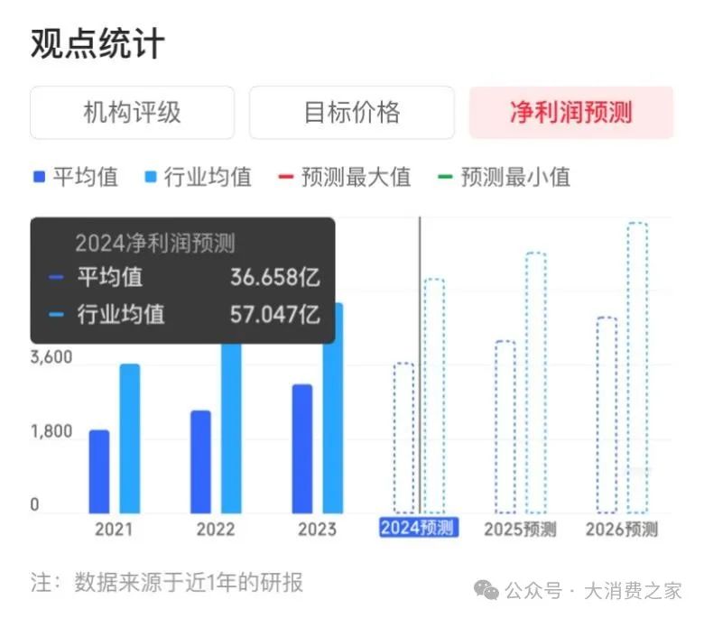 今世缘目前尚未公布2024年全年业绩预告,但基于近一年内的研报,各家机构对其2024年净利润预测均值为36.66亿元,较去年同比增长16.89%。尽管如此,这一利润小于数值为57.05亿元的行业均值,另外其预计增速也低于过去几年的平均表现。