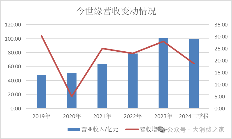 在2019-2023年期间,今世缘的业绩呈现出一定的增长态势。具体来看,其各年收入分别为48.70亿元、51.19亿元、64.06亿元、78.85亿元和100.98亿元。然而,到了2024年前三季度,公司实现营业收入99.41亿元,虽然同比增速达到了18.86%,但相较于2021至2023年期间超过20%的收入增速,出现了放缓的现象。
