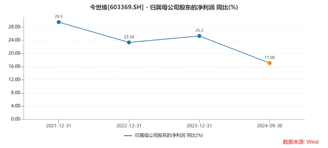 2024年前三季度,今世缘实现归母净利润30.86亿元,同比增长17.08%,该增速较往年有所放缓,此前2021年至2023年的增速分别为29.5%、23.34%、25.3%。