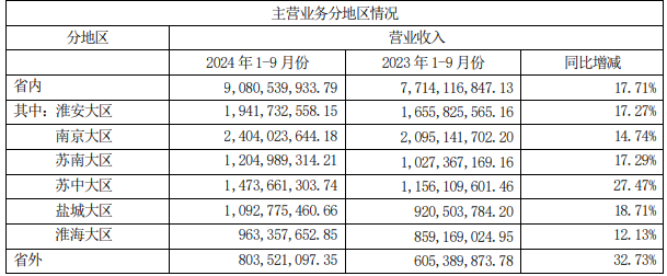 不过,即使公司的收入已经突破百亿元,但收入仍依赖其大本营——江苏省,去年前三季度,省内收入90.81亿元,占比91.87%,而省外收入仅8.04亿元,占比8.13%。