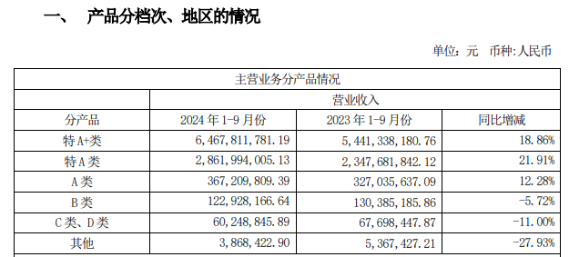去年前三季度,公司特A+类(300元以上)收入为64.68亿元,同比增长18.86%;特A+类(100-300元)收入为28.62亿元,同比增长21.91%;特A类(50-100元)收入为3.67亿元,同比增长12.28%。