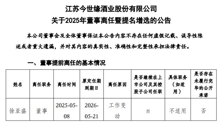 在从今世缘离职前,徐亚盛已经从公司大股东今世缘集团的管理名单中退出。2025年4月中旬,今世缘集团执行公司事务董事、总经理和公司法人从徐亚盛变更为周辉。周辉于2024年5月加入今世缘,担任董事一职。